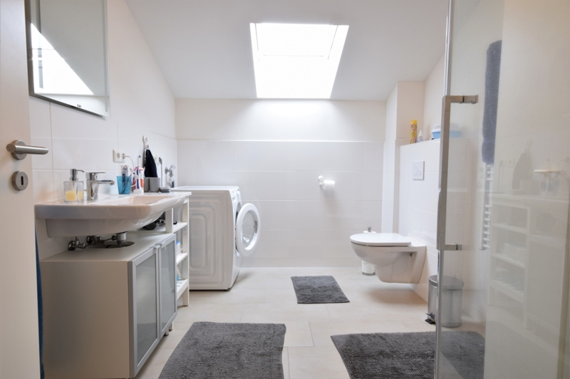 Das modern gestaltete Badezimmer überzeugt mit einer bodentiefen Dusche und hochwertiger Sanitärausstattung.