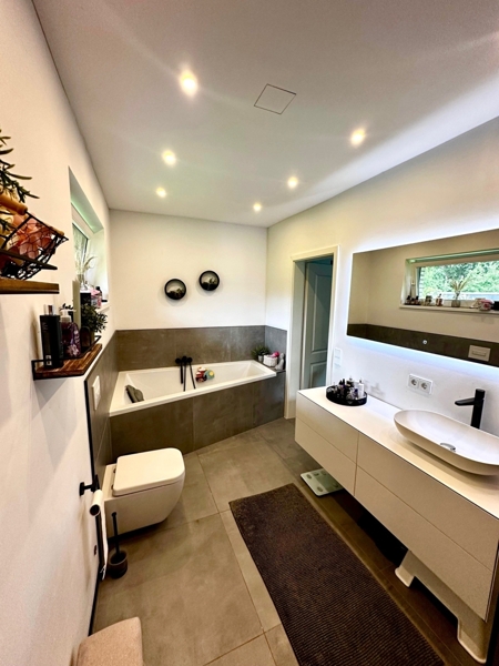 Die Öl-Heizungsanlage aus 2002 wurde nun im Umbau für Solarthermie vorbereitet und bereits durch einen neuen wassergeführten Hajduk Ofen im Wohnzimmer ergänzt. Des Weiteren wurde das gesamte Erdgeschoss mit einer neuen Fußbodenheizung und neuen Fliesen ausgestattet. Alle Decken wurden erneuert, gedämmt und mit Lichtspots versehen. Der gesamte Kellerabgang wurde neu und modern gestaltet. Das Badezimmer und die Küche wurde erneuert.