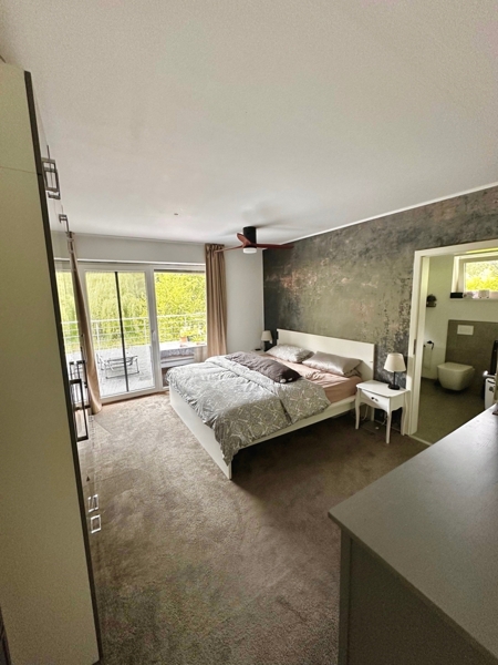 Das Schlafzimmer mit direktem Zugang zur Terrasse ist ausreichend dimensioniert und bietet mit dem direkt angrenzenden neuen Badezimmer alles, um hier gut zu entspannen.