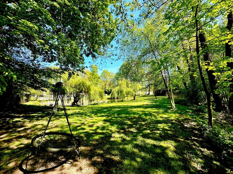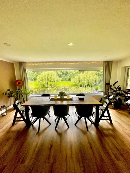 Das Wohnzimmer ist sehr geräumig und bietet durch den schönen neuen Ofen eine besondere Atmosphäre, die mit dem herrlichen Ausblick auf den großen Garten und den Seerosenteich ein besonderes Ambiente verbreitet.