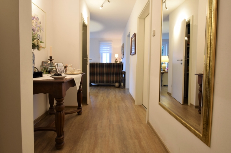 Der Flur führt in den attraktiven Wohn-/Essbereich mit der angrenzenden Einbauküche. Die Küchenzeile ist modern, praktisch und hell gestaltet. Mehrere bodentiefe Fenster bringen viel Tageslicht in diesen Wohnbereich.